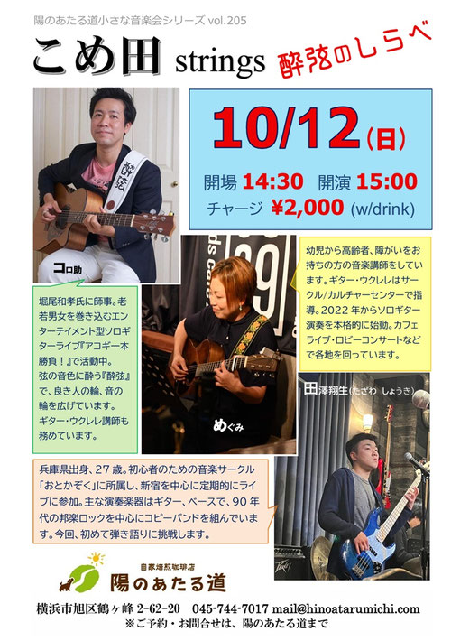 10月12日(日)は陽のあたる道小さな音楽会vol.205「こめ田strings〜酔弦のしらべ」でした。
