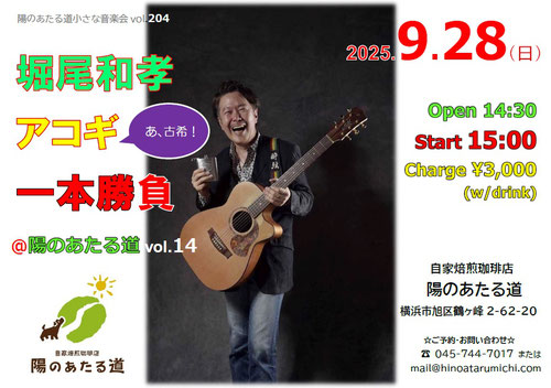 9月28日(日)は、陽のあたる道小さな音楽会vol.204「堀尾和孝アコギ一本勝負vol.14」でした。陽のあたる道では年に一度の堀尾さんのライブ。お店オープンから14年目にして14本目の「一本勝負」。8月に70歳になられた堀尾さんの「"あ、古希"一本勝負」でもありました。
